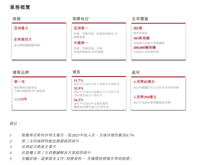 根据弗若斯特沙利文报告,按 2023 年收入计,顺丰是中国及亚洲最大的综合物流服务提供商,也是全球第四大综合物流服务提供商。