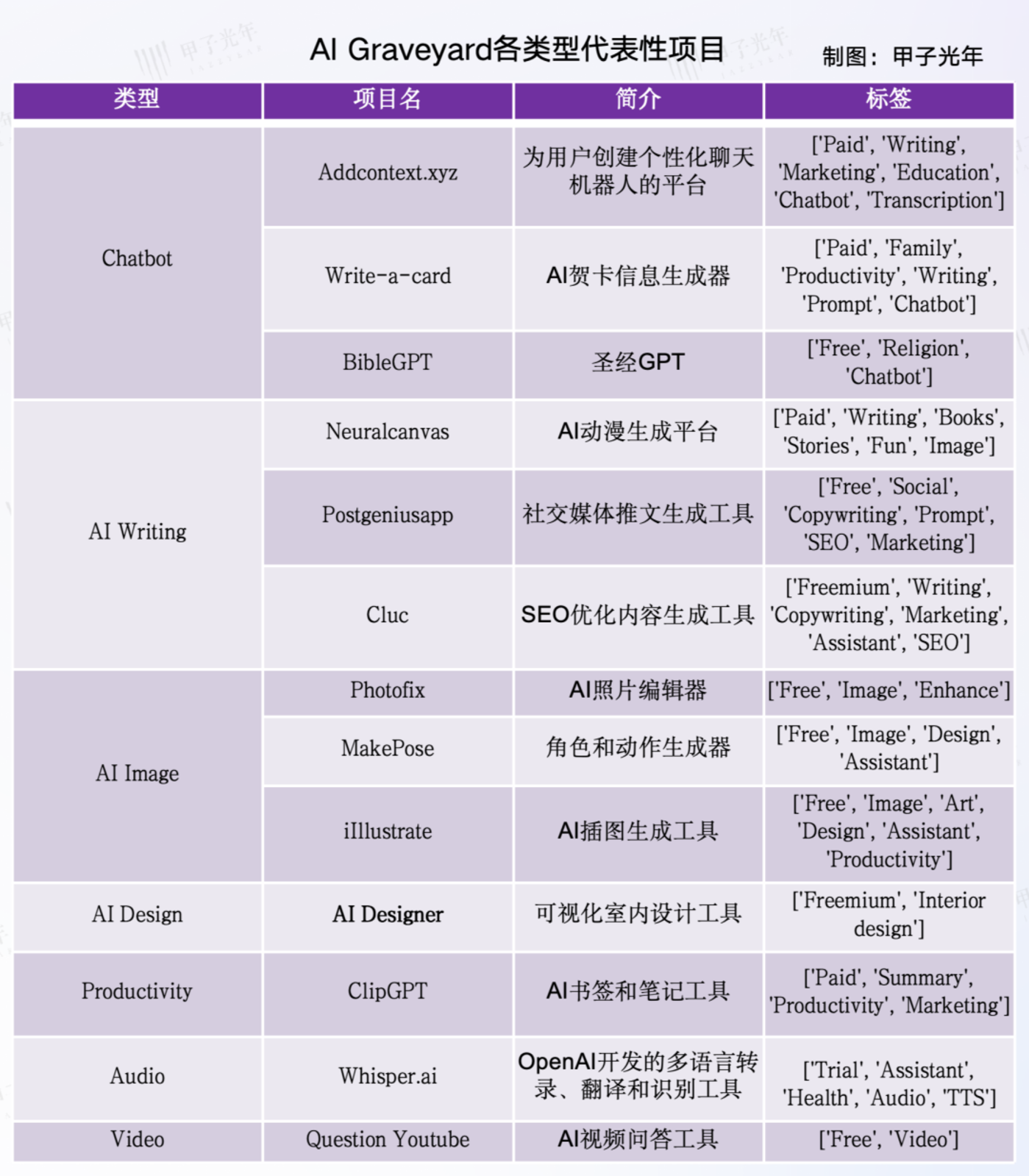 根据 「甲子光年」 统计,截至 2024 年 6 月,这份名单共收录了 738 个已经死去或者停止运行的 AI 项目,具体来看: