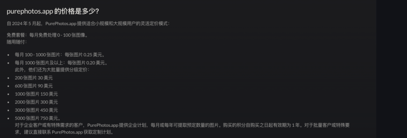 以文生图产品 Purephotos.app 和 AnimeAI.lol 为例,前者为企业用户提供积分购买服务,后者则将产品和服务打包成不同的套餐出售。或许是意识到了企业用户不赚钱,自 2024 年 5 月起,Purephotos 开始尝试最近流行的 「随用随付」 的收费模式,用户生成的图片张数越多,分摊到单张图片上的费用越便宜。
