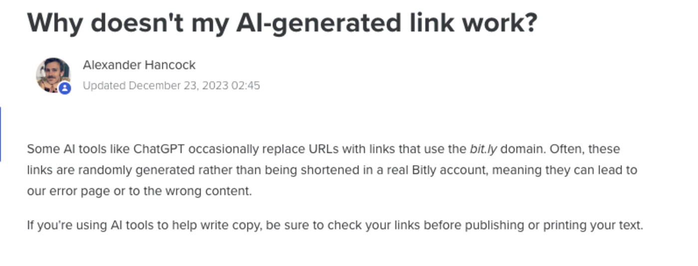 Bitly 工作人员对于部分 AI 工具生成短链错误的原因解释,图片来源:Bitly