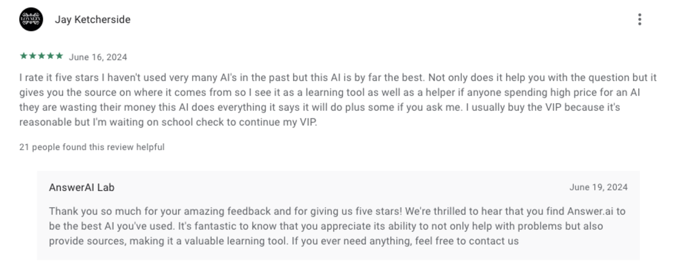 和上一波主打 「拍照搜题」 的 AI Tutor1.0 的产品不同,Answer AI 是一款 AI Tutor2.0 的产品,不仅能搜题,还能解题,在给出答案的基础上还可以给出论证过程。题目也不局限于题库中的题,而是可以在能力范围内解答从没见过的新题目,这极大解决了学生用户 「有答案但看不懂思路」「遇到新题目不会」 的痛点。该产品出来之后,Answer AI 在互联网上好评如潮,不少用户表示 「这是我用过的最好的 AI 产品」。