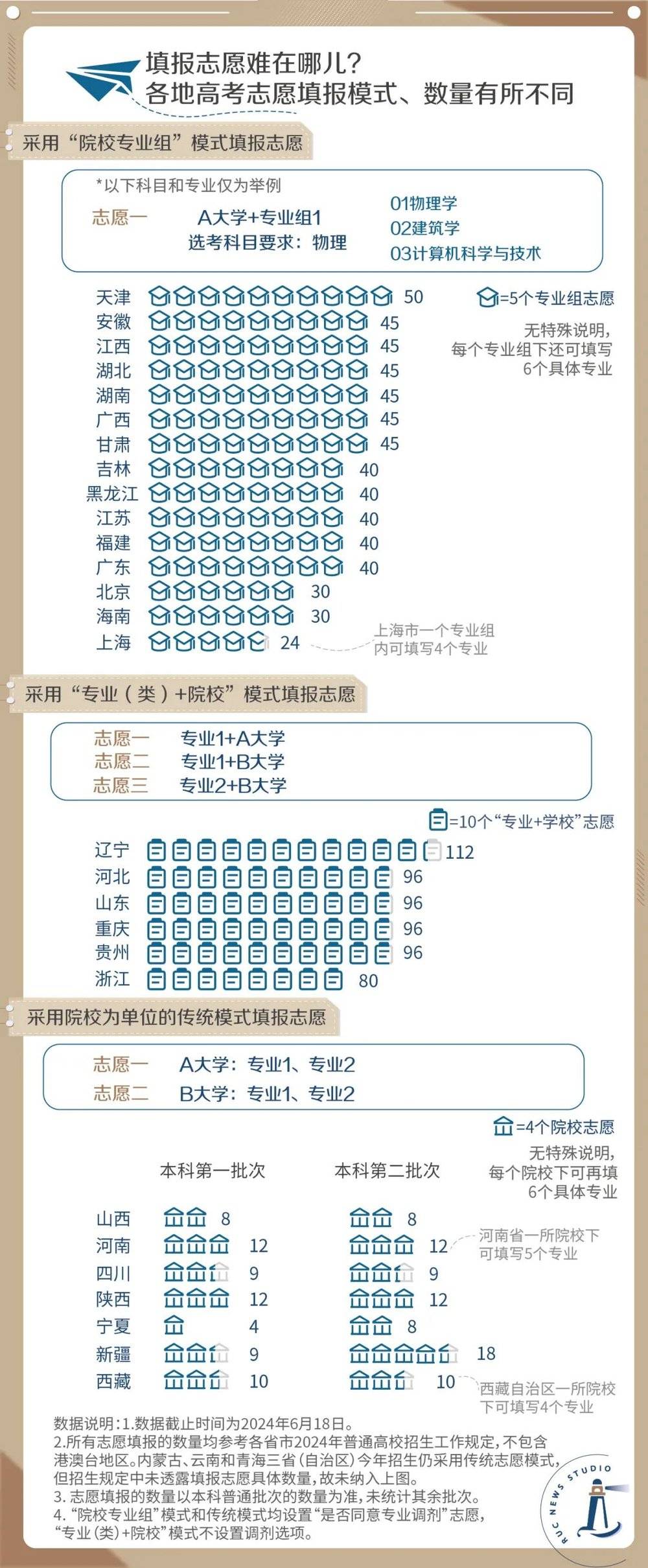 抛却规则的差别,这两种新型志愿填报模式都提供了更丰富的选择可能性。以 2024 年高考为例,在 「院校专业组」 模式下,天津市最多可以填报 50 个专业组志愿,每个专业组下还可最多再填写 6 个具体专业。而 「专业 (类)+院校」 模式的选择更多,辽宁省的高考志愿填报数量最多可达 112 个。