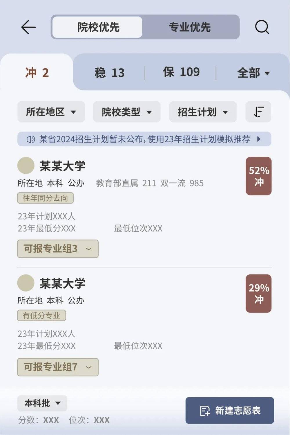 以某软件的 AI 系统填报功能为例,用户首先需要填写高考所在的省份、所选科目、预估的分数以及考试位次。随后,系统会基于这些个性化信息,以历年的分数线为依据,智能地呈现 「院校优先」「专业优先」 两种不同的填报策略,以及 「冲-稳-保」 三个档次的志愿选择。