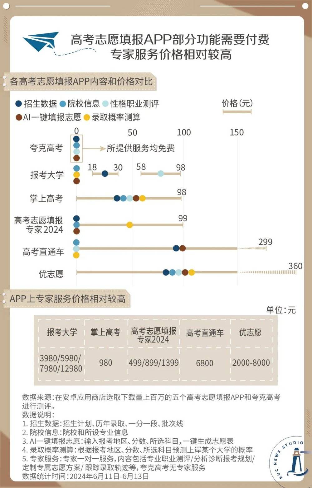 为了比较线上 APP 的服务和价格,我们选取了目前下载量最高的 5 个付费高考志愿填报 APP 进行测评,并以免费志愿填报平台 「夸克高考」 作为对比。