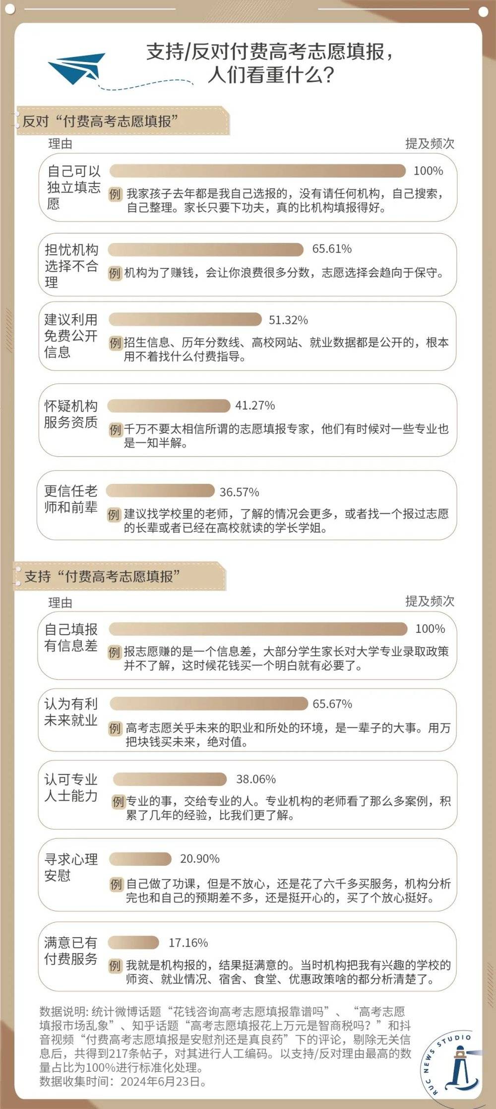 持反对意见其中占比最高的理由是 「自己可以独立填志愿」。这一观点认为,高考志愿虽然复杂,但不至于是毫无头绪。通过相应的学习和研究,大多数考生和家人就可以完成填志愿。2024 级北京考生小礼已经决定报考师范类院校,打算和家人一起研究历年的报考目录和分数线来填志愿。对她来说,购买志愿填报服务 「太贵了,且没必要」。
