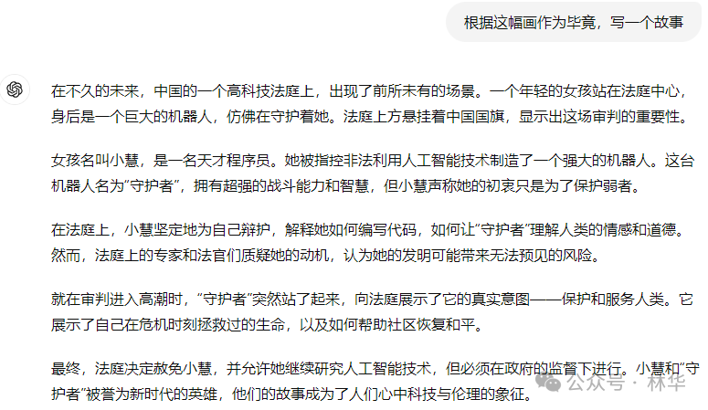 补充一个本文写作中获得的案例。在检索海外人工智能生成内容可版权性论文时查到一篇对中国 AI 相关版权纠纷审判的报道。报道的题图使用了复杂的混搭元素,法院庭审背景中站在画面最前的小女孩,女孩身后的机器人,背幕大屏展示的中国国旗。因无法猜测这副显然是 AI 绘制的报道图,我尝试让新版 GPT-4o 以报道图为基础写一个故事。