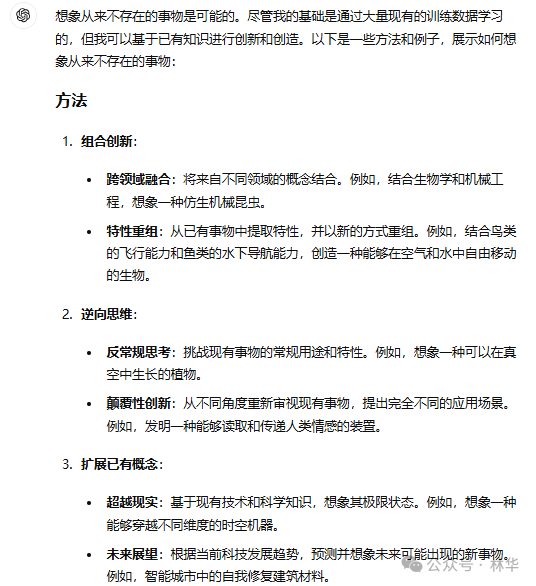 一个更简单的研究方法是直接和人工智能对话来进行测试。当然基于不同 AI 之间巨大的水平差异,只推荐和 GPT-4 及其以上版本实验。以下提供两张对其创造能力的问答截图。