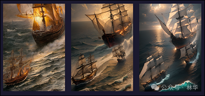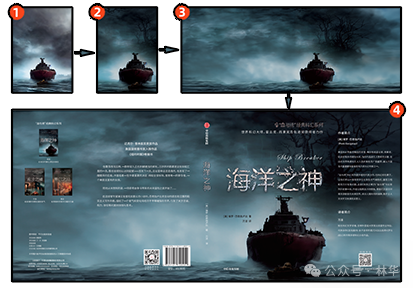 设计师在书封绘制中,「..... 以 《海洋之神》 的书封为例,根据文本关键词先生成基础底图,再通过调整画面色调、主体位置和利用 AI 图片扩展功能,一键生成了书封全景图,最后排版完稿」。定稿这张乌云密布的海上幻境见下图: