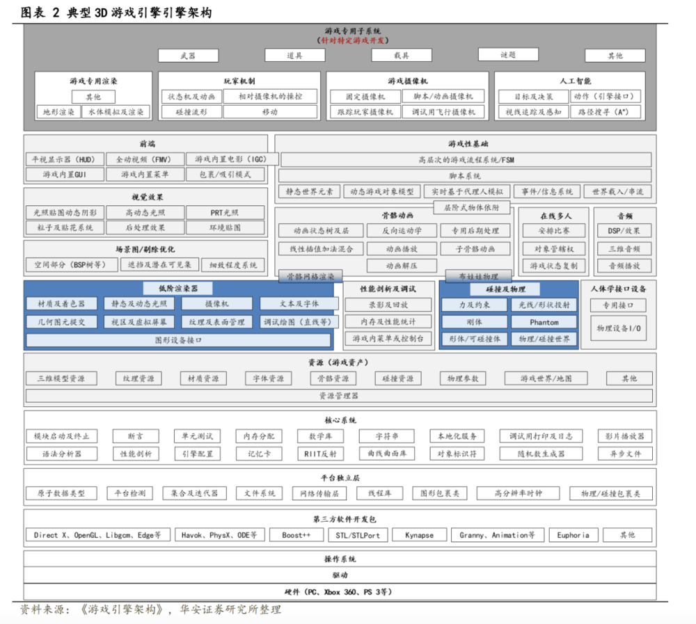 发展到今天,一个游戏引擎基本都会包括渲染、物理、骨骼动画、音效、视觉效果、人工智能、网络引擎、场景管理等核心功能模块。其中,负责呈现出足够真实的画面和游玩体验的渲染引擎和物理引擎则是核心竞争力的所在。