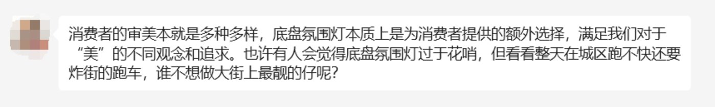 一种是觉得这套氛围灯很炫酷,觉得这就是为消费者提供的额外选择,谁都想成为大街上最靓的仔。