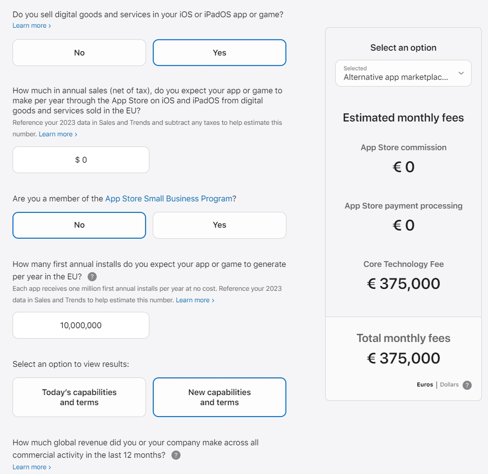 简单算来,对于一款年安装次数达到 1000 万次的 App 而言,开发者一年下来需要支付 450 万欧元的 「核心技术费」。这种收费方式自然也引发了开发者社区的激烈讨论,许多害怕被这笔收费搞破产的开发者自然选择留守 App Store。