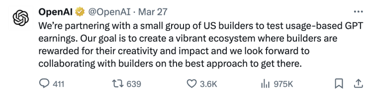 到 3 月底,眼看 GPTs 快要 「凉凉」,OpenAI 不得不紧急决定与小部分美国开发者合作,基于 GPTs 的使用情况发放相应奖励。目标是 「创建一个充满活力的生态系统,让开发者的创造力和影响力得到回报」。至于更具体的奖励细节,OpenAI 并未披露。