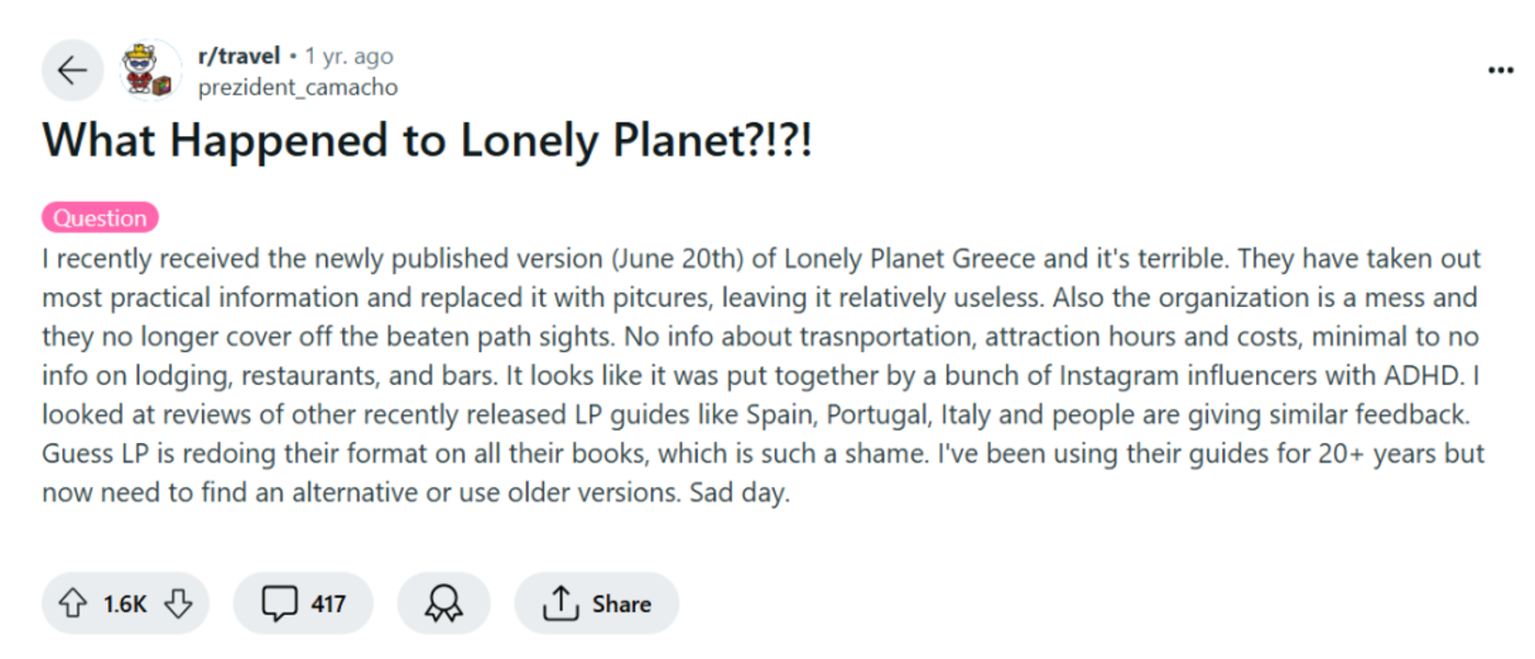 LP 的一大传奇特性就是 「揭示有趣、偏离路径的旅行地点」。如果同样的特性是来自缺乏监管和编辑的 UGC,而不是由可控的少数作者把持,你猜以前在小红书颇具争议的 「坑爹种草」「夺命露营」 是不是做的同一件事?