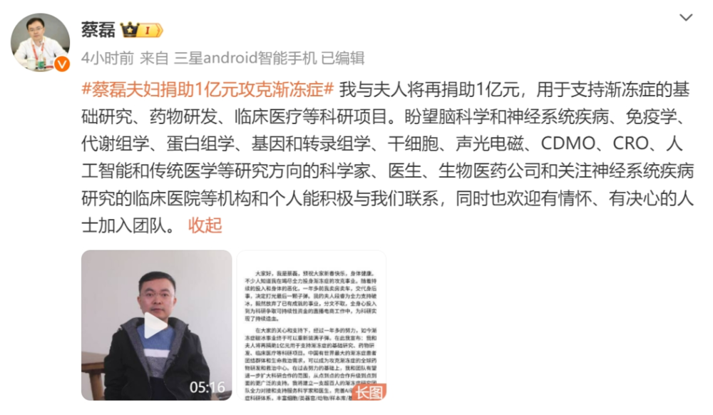 蔡磊是京东前副总裁,曾经帮助京东开出全国第一张电子发票。他为了治愈渐冻症累计投入上千万元资产,今年年初又宣布将捐助 1 亿元用于攻克渐冻症相关科研项目。