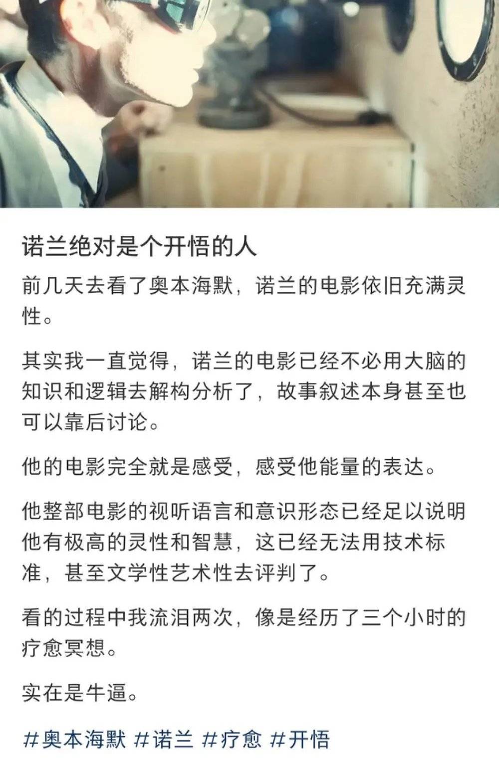 部分影迷觉得诺兰也开悟了,看 《奥本海默》 犹如经历一场疗愈冥想,《盗梦空间》 和 《信条》 不异于深度净化和催眠,诺兰的伟大无需多言。