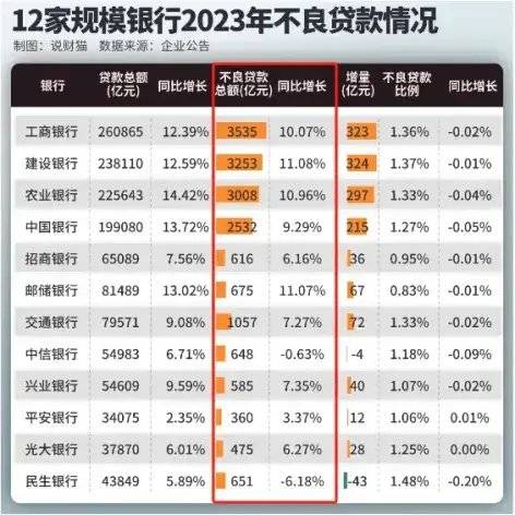 据 「说财猫」 统计,12 家国内规模银行中,去年不良贷款总额正增长的就有 10 家。