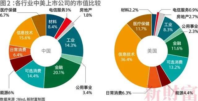 我们的上市公司市值构成中,金融行业凭 20.1% 的占比遥遥领先。反而是金融大国美利坚,信息技术行业占比高达 36.4%,金融行业只占 11.6%。