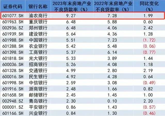 重庆农商行更是 「两连升」,2022 年房地产业不良贷款率已经高达 7.28%,2023 年直接飙升到了 9.28%。在一众上市银行里高居榜首。