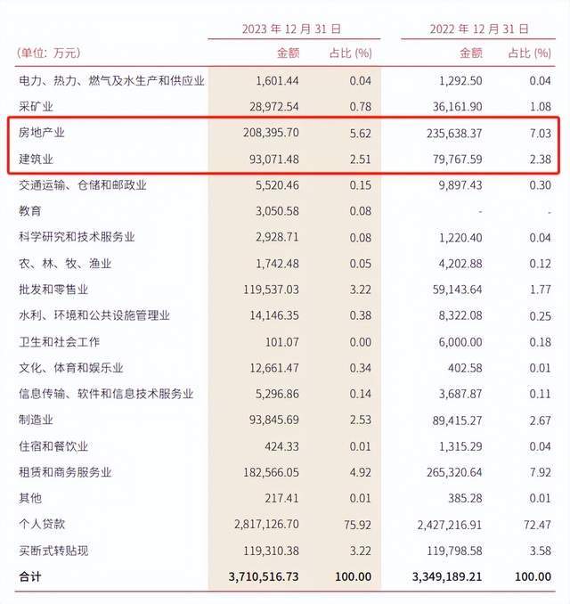 以三湘银行为例,2023 年房地产业、建筑业贷款金额合计超 30 亿元,在贷款余额中占比超 8%。尽管年报中并未披露涉房贷款的不良情况,恐怕很难乐观。