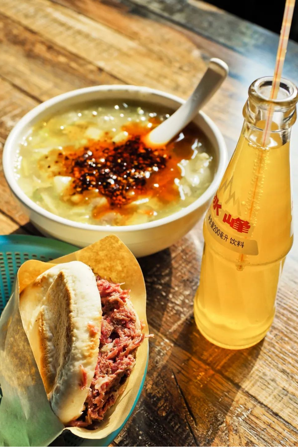 腊牛肉夹馍、肉丸糊辣汤、冰峰,西安人常见的早餐组合。摄影/陈仓识火