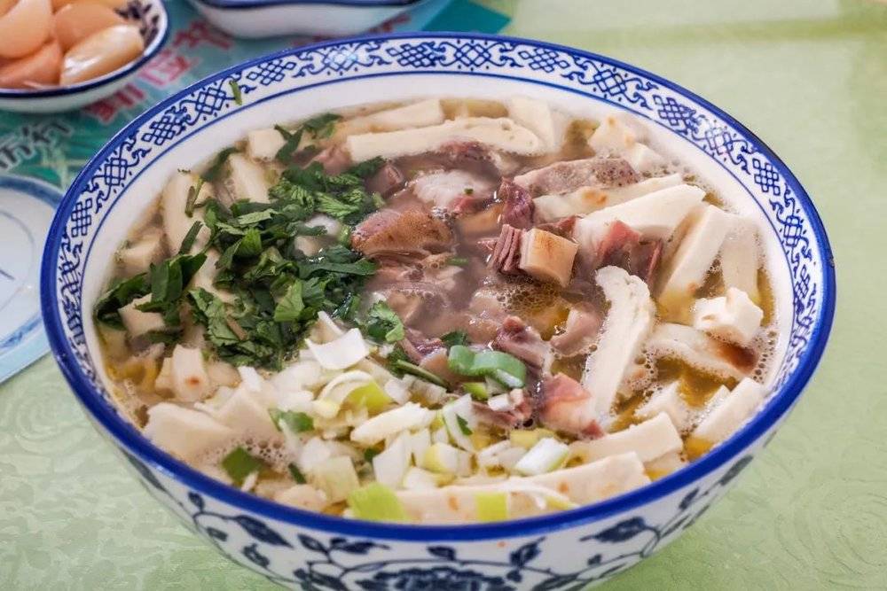 稍稍复杂点的,汤汤水水的泡馍就是吃到顶肚的正餐。西安的羊肉泡馍、牛肉泡馍鲜香可口,葫芦头泡馍味醇汤浓;千阳的大肉泡馍,猪肘子皮滑肉嫩;鄠邑的辣子疙瘩泡馍,用红油爁 (làn)的猪肉块调汤;华阴的麻食泡,麻食菜汤底配料丰富……