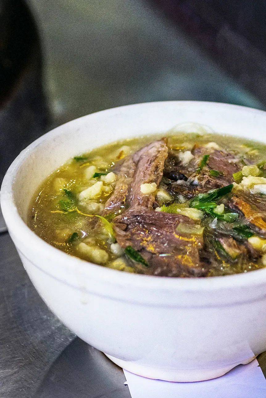 老陕慢悠悠地将死面烙制的饦饦馍,掰成了黄豆粒大小——也只有这样,硬邦邦的死面馍才能在烩煮的过程中变得柔软又不失筋道。待一碗加好了羊肉片和粉丝,配好了糖蒜和辣子酱的羊肉泡馍端上桌来,大家便用筷头从碗边一层层地刮馍送入口中。