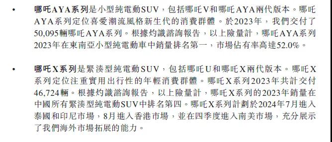 当前,哪吒在泰国和印度尼西亚的工厂已经建成并投产。截止到 2023 年 12 月 31 日,哪吒在海外已经安排或设立共计 100 个的销售 (售后) 网点。并且,哪吒 AYA 在 2023 年也取得了东南亚小型纯电汽车上险量第一的成绩。