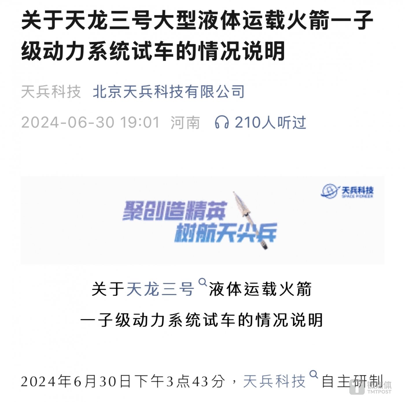 天兵科技于今晚 19 点左右发布 《关于天龙三号大型液体运载火箭一子级动力系统试车的情况说明》(下称 《说明》) 表示,试车过程中,一子级火箭正常点火,发动机推力达到 820 吨,因箭体与试验台连接处结构失效,一子级火箭脱离发射台,在升空后,箭上计算机主动关机,火箭跌落在距离试车台西南 1.5 公里的深山中,箭体跌落山中后解体。