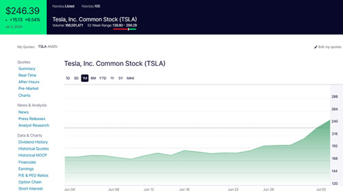 周三继续上涨,特斯拉股价就已连续 7 个交易日上涨,从 6 月 25 日,一直持续到 7 月 3 日,也就是从上周二到本周三。