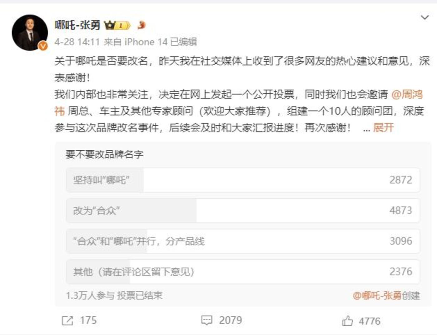 高潮发生在更名,张勇在微博上发起了 「哪吒是否应该更名」 的投票,在抖音上也发了好几个视频说这件事,这让哪吒的讨论度更高了。值得注意的是,哪吒之前也回应过这件事,现在 「炒冷饭」,显然有营销考量,这说明哪吒的营销策略已经开始摆脱传统营销方式的桎梏。