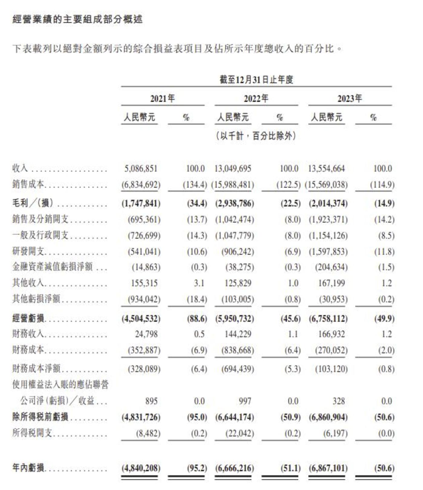 从单车收入来看,哪吒已经把性价比标签按到了自己身上,这让它在市场上获得了立足之地,但也让它们背上了亏损的包袱。在 2021 年-2023 年,其亏损分别为 48.40 亿元、66.66 亿元和 68.67 亿元。同时,其毛利率一直都是负数,2023 年为-14.9%,距离转正还有较大距离。截至 2023 年 12 月 31 日,哪吒汽车现金及等价物为 28.36 亿元,但其短期借款余额为 43.17 亿元。