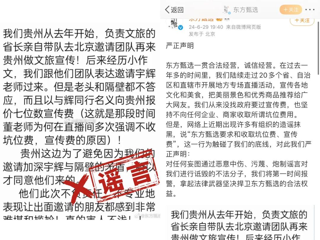 6 月 29 日,东方甄选表示,近期,网络上出现许多有组织的造谣抹黑,说 「东方甄选要求和收取坑位费、宣传费」,公司表示,绝无此事,不会和商家要求任何坑位费用。