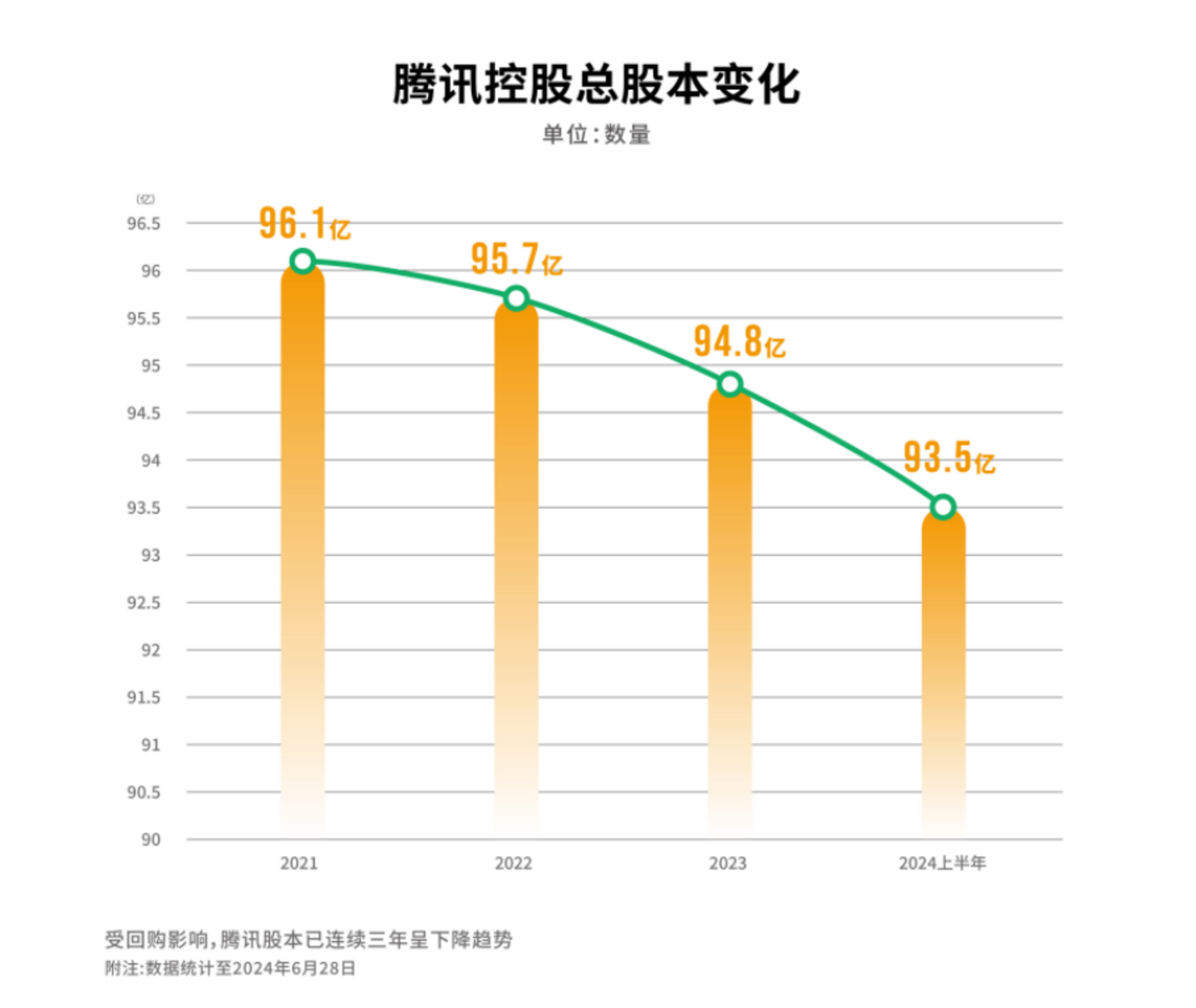 随着腾讯 2022 年开始加大回购力度,总股本也在稳步减少,已经从 2022 年的 96 亿股逐步下降到目前的 93.5 亿股,股本减少也有利于提高腾讯股票的内在价值。