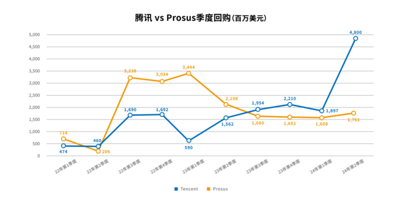 如图所示,从 2023 年 3 季度开始,腾讯回购已经连续 4 个季度超过 Prosus 减持金额,且差距不断拉大,到今年二季度,腾讯回购总额已经是 Prosus 减持规模的 2.7 倍。