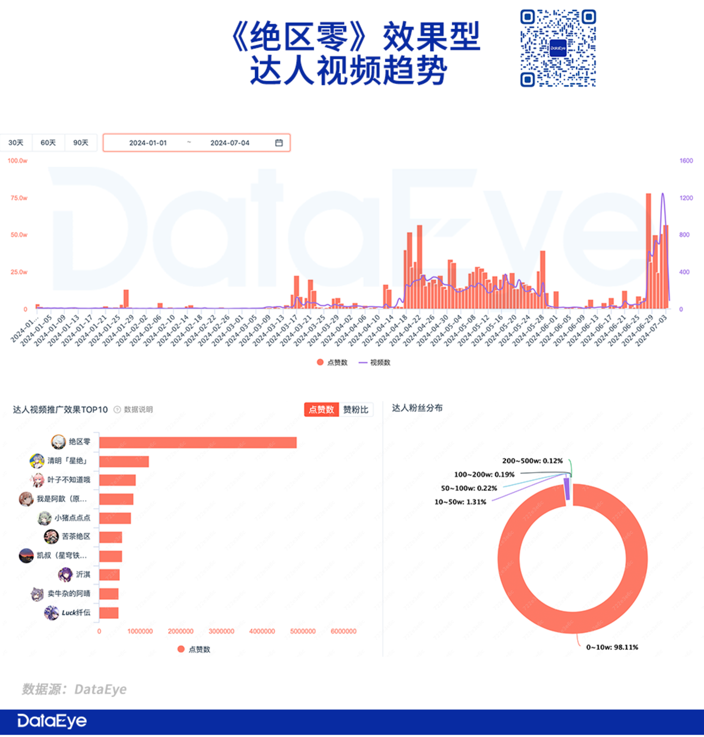 DataEye ADX 数据显示:《绝区零》 早早开启了抖音效果型达人视频预约,今年 4-5 月 (喧响测试) 出现一波峰值,临近公测出现最高峰,单日挂链的效果型视频最高超 1200 条。
