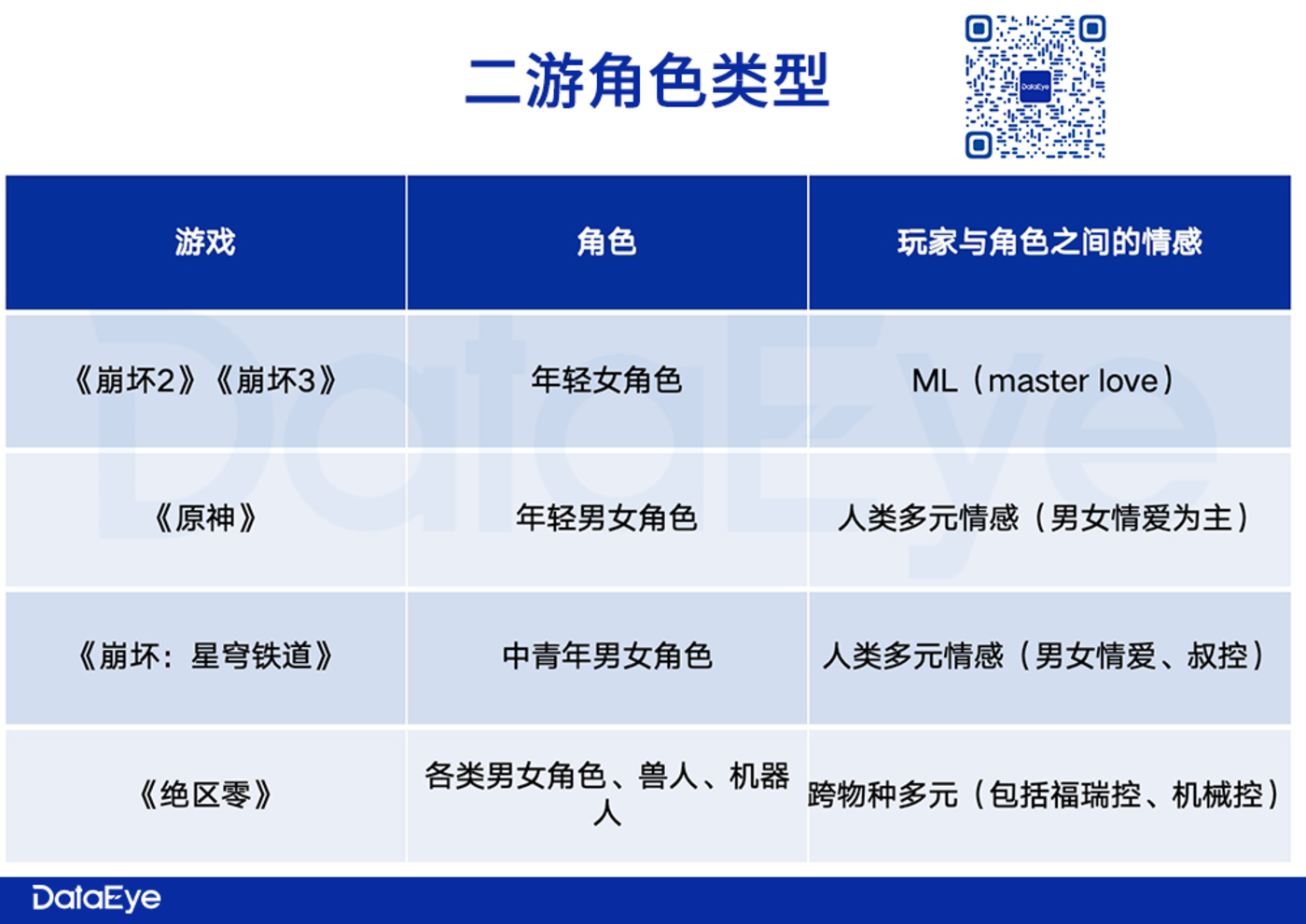 米游进阶史,约等于二游破圈史。DataEye 研究院盘点了米哈游四款游戏具体情况,如下表,四款游戏是持续扩展角色、玩家与角色之间的情感的边界。从传统的日式二次元 「一男多女」 的 Master Love,扩展到人类更多元的情感,到 《绝区零》 已经 「跨物种」 了 (多元 XP 的老外狂喜) 然,《绝区零》 最终能破圈到泛用户,还是局限于独特的赛博朋克+街头题材?仍需观察,我们倾向于前者。