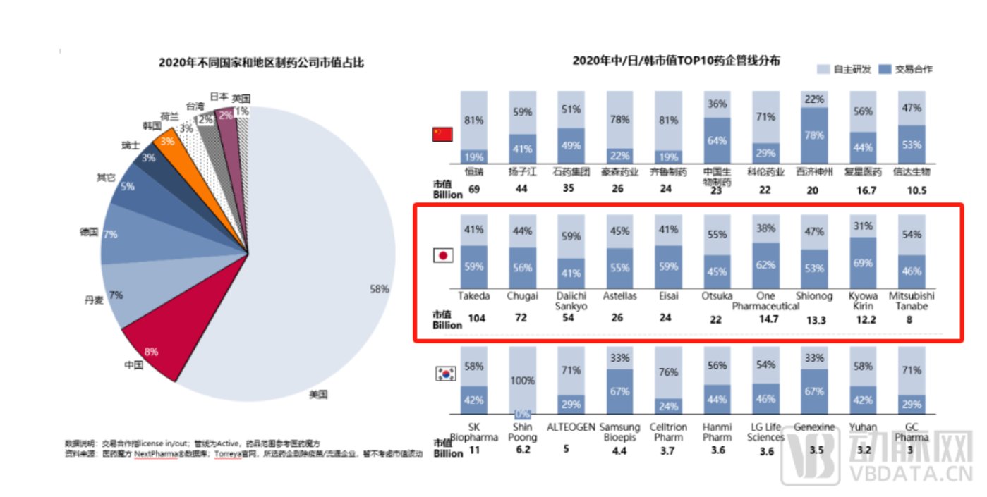 众所周知,日本是全球第三大药品市场。根据 Credovo 杂志文章 《Drug Development Strategy in Japan 2021》 显示,2020 年日本医药市场达到 1360 亿美元。而在 2023 年度 《全球制药企业 50 强》 中,日本也占据六席,分别是武田、安斯泰来、大冢、第一三共、中外制药和卫材。