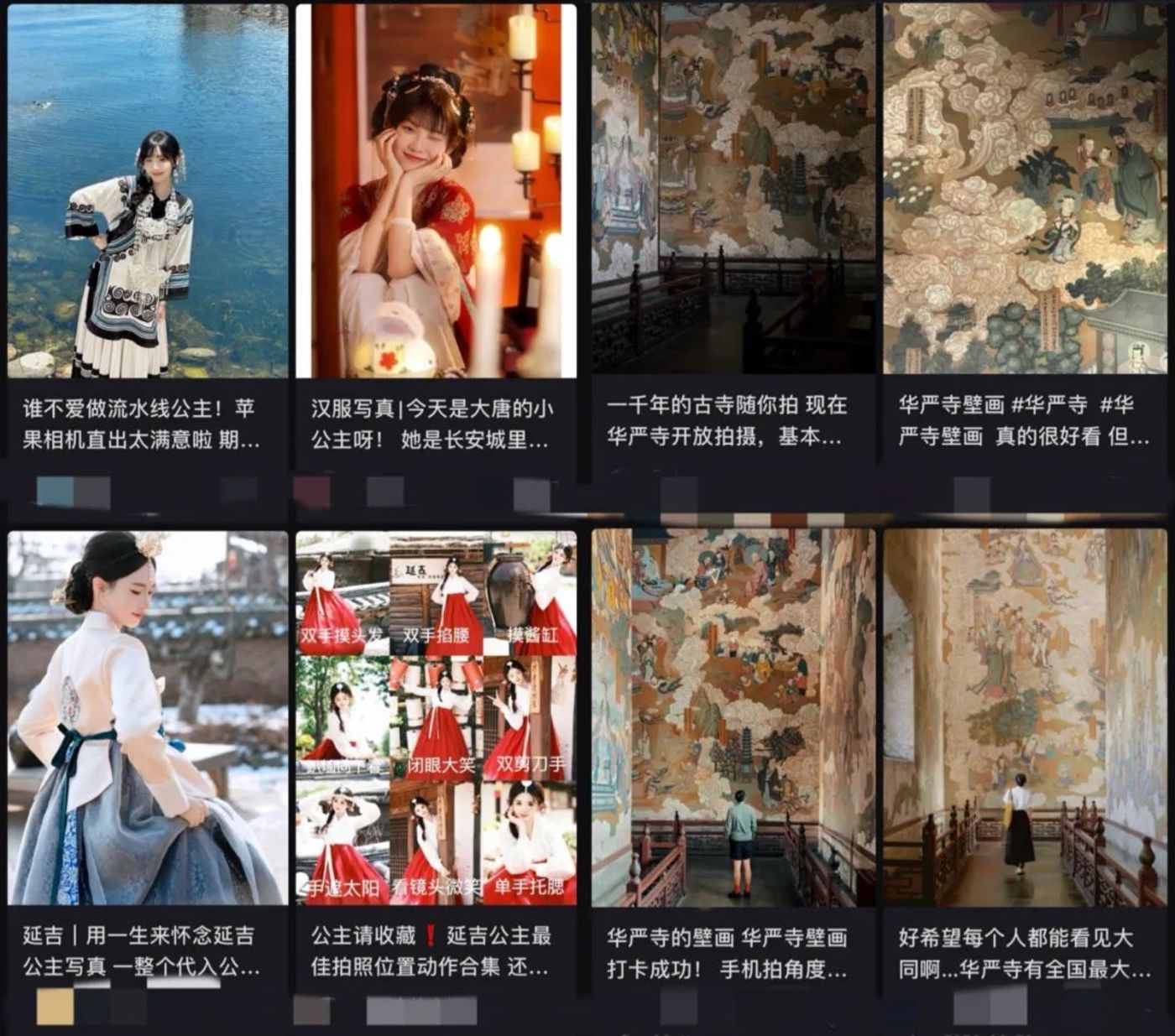 最明显的例子是各式各样的 「公主写真」。作为女性用户主导的平台,小红书顺理成章地为女性用户挖掘了 「写真」 这一消费产品,从延吉的 「朝鲜族公主」、洛阳的 「大唐公主」 再到哈尔滨的 「俄罗斯公主」 以及泉州的 「簪花女写真」,几乎每个 「网红城市」 都有自己的公主。此外,由于站内浓厚的用户分享氛围,小红书的 「打卡效应」 也非常明显。比如 2023 年小红书用户分享的山西华严寺普光明殿壁画的拍照攻略,迅速引起站内用户对山西华严寺的兴趣,大批用户前往拍照打卡点,与千年壁画来上一张合影。
