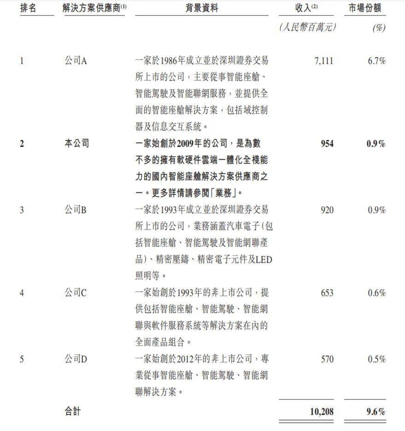 此外,虽然博泰车联网是国内第二大智能座舱解决方案提供商,但市场份额仅为 0.9%,前五大供应商市场份额合计仅为 9.6%,排名第一的供应商市场份额便高达 6.7%,这足以说明智能座舱解决方案竞争何其激烈。