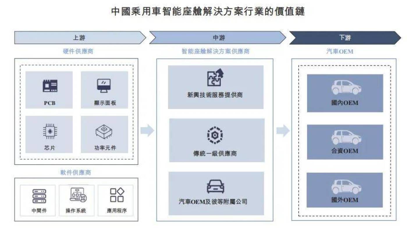 以公司收入占比近 9 成的智能座舱解决方案为例,公司处于产业链中游,上游为芯片等原材料供应商,下游则是汽车制造商。