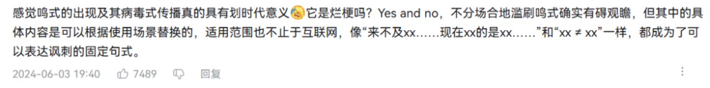 这一点在此前 《鸣潮》 发布时也有绝佳的案例展现。「XX 是这样的,XX 只要 XX 就可以了,而 XX 需要考虑的事情就很多了。」 这是来自 《鸣潮》 剧情中的一句话,由于逻辑逆天,且泛用性极强,被网友引用到各种类型视频的评论区,成为了比 《鸣潮》 游戏本身还火的 「鸣潮公式」。