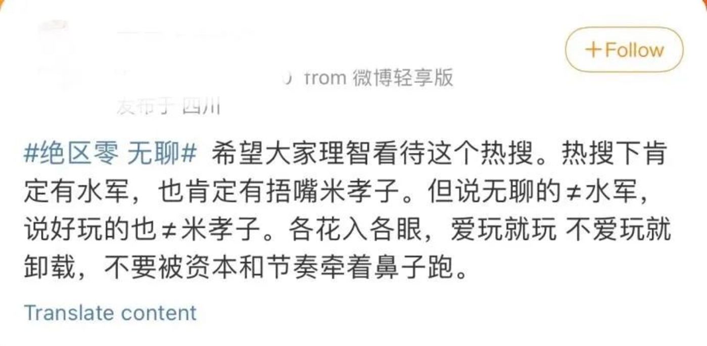 也有不少玩家为 《绝区零》 挽尊,认为 「无聊」 的热搜词条是歹毒的商业竞争,急着指摘的都是 「别家」 买来的水军。毕竟才开服不久词条就出来了,大部分玩家还没有足够的游戏时长来进行体验。