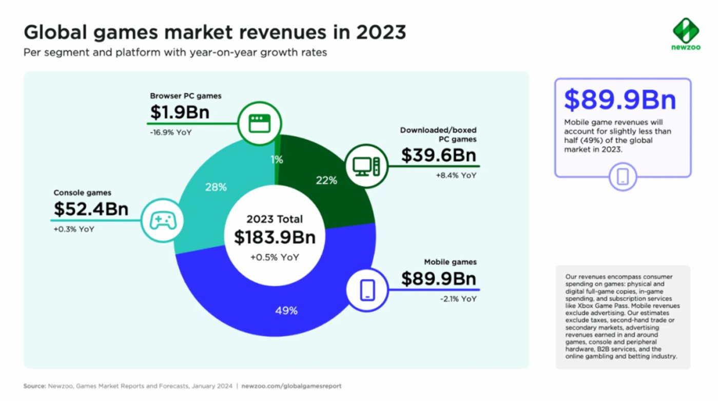 而根据 Newzoo 数据统计,2023 年 PC 游戏销售、微交易和订阅的收入比 2022 年增长了 8.4%,主机游戏的收入仅增长了 0.3%,而移动游戏降低了 2.1%。虽然很难说 PC 游戏就此崛起了,但一向重视多端开发的米哈游,自然是这个市场走向背后的重大赢家。