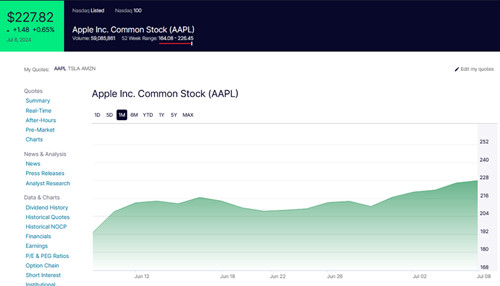 在当地时间周一美股收盘时,苹果报 227.82 美元,创下新高,较前一交易日收盘时的 226.34 美元上涨 1.48 美元,涨幅为 0.65%。