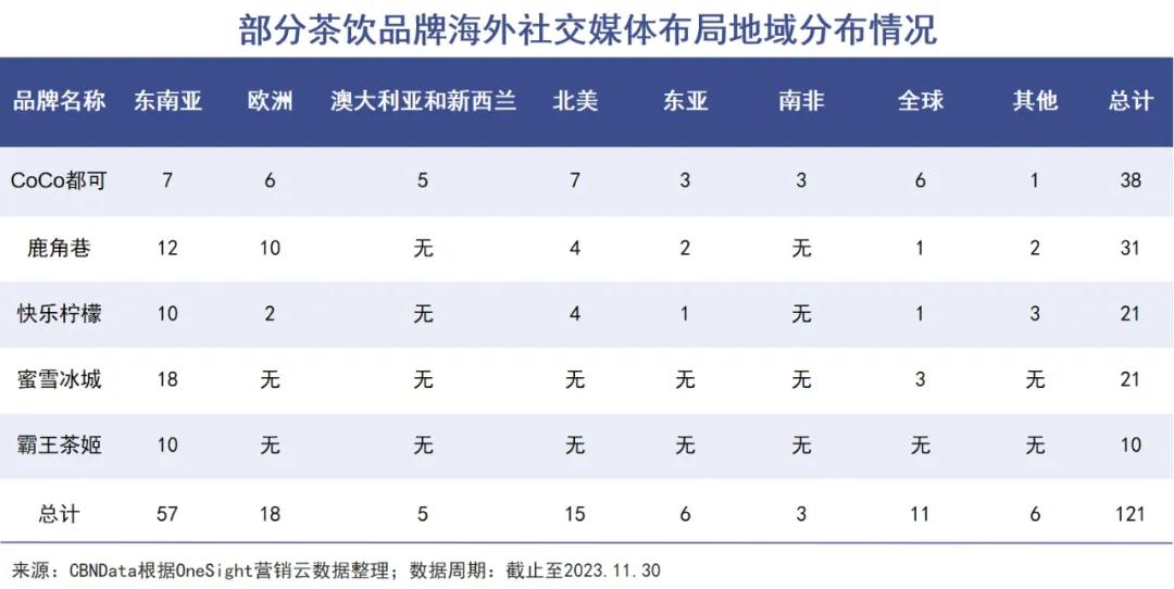 OneSight 营销云数据显示,东南亚是目前茶饮品牌出海的首选。根据茶饮品牌社交媒体的布局看,CoCo、鹿角巷、蜜雪冰城、霸王茶姬等品牌都将东南亚作为出海重镇,其次是欧洲和北美,除此之外,中东也成为部分茶饮品牌出海掘金的新目的地。