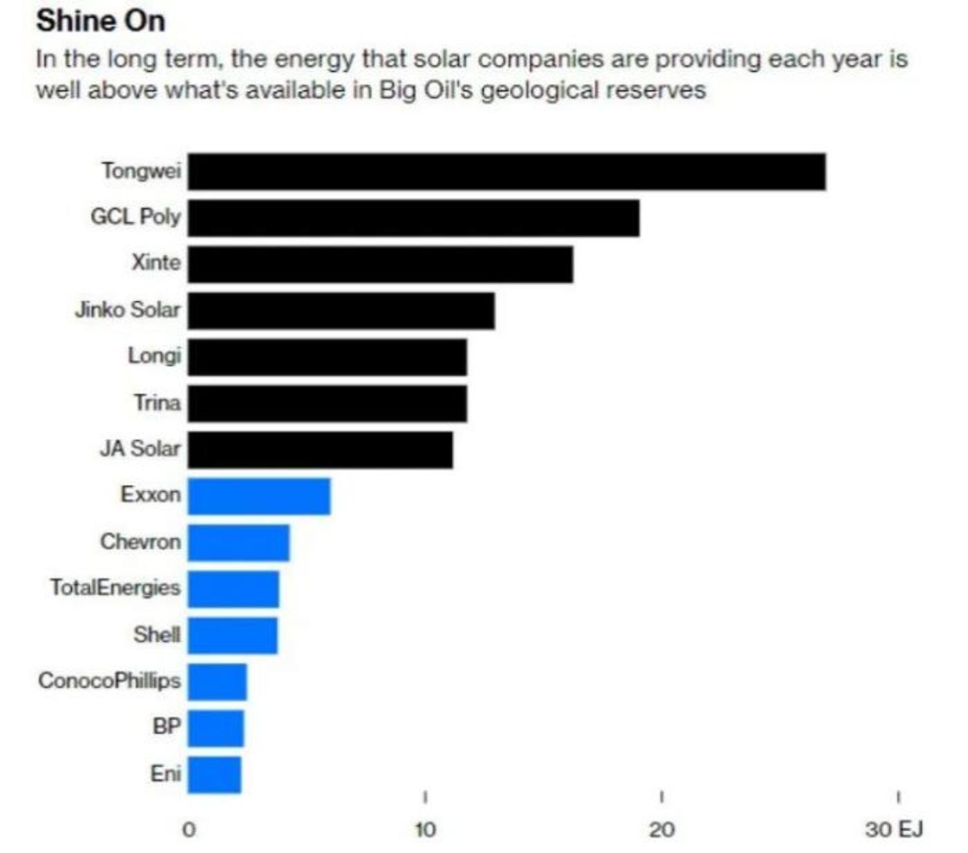 而排在最大的石油公司埃克森前面的,无一例外全是中国的光伏公司:通威股份、协鑫科技、新特能源、晶科能源、隆基绿能、天合光能、晶澳科技。