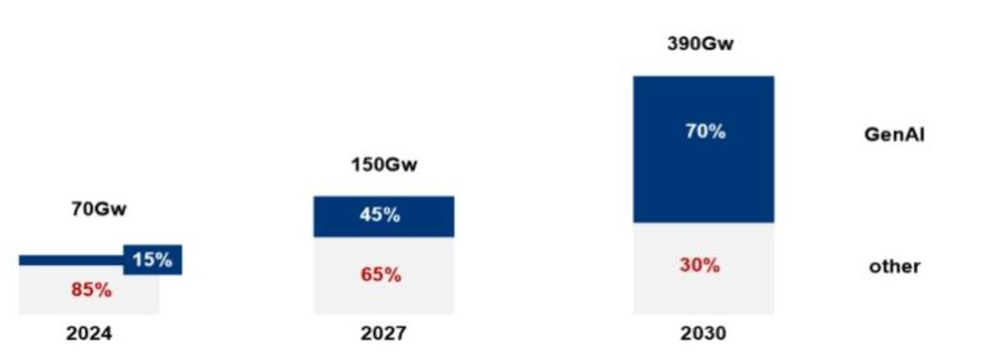 根据咨询机构麦肯锡 2024 年的最新研究,AI 对算力需求的拉动将直接带动数据中心建设规模提速,同时带来对电力需求的爆发式增长。保守估算,到 2030 年,全球数据中心服务器的能耗将高达 390GW,而其中 70% 是被 AI 算力所消耗。