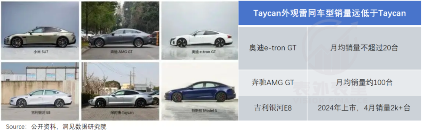 可 Su7 的放量,让尊贵的保时捷车主可能会被误认为是没啥钱的屌丝,毕竟已经有不少人将 Taycan 错认成 Su7。