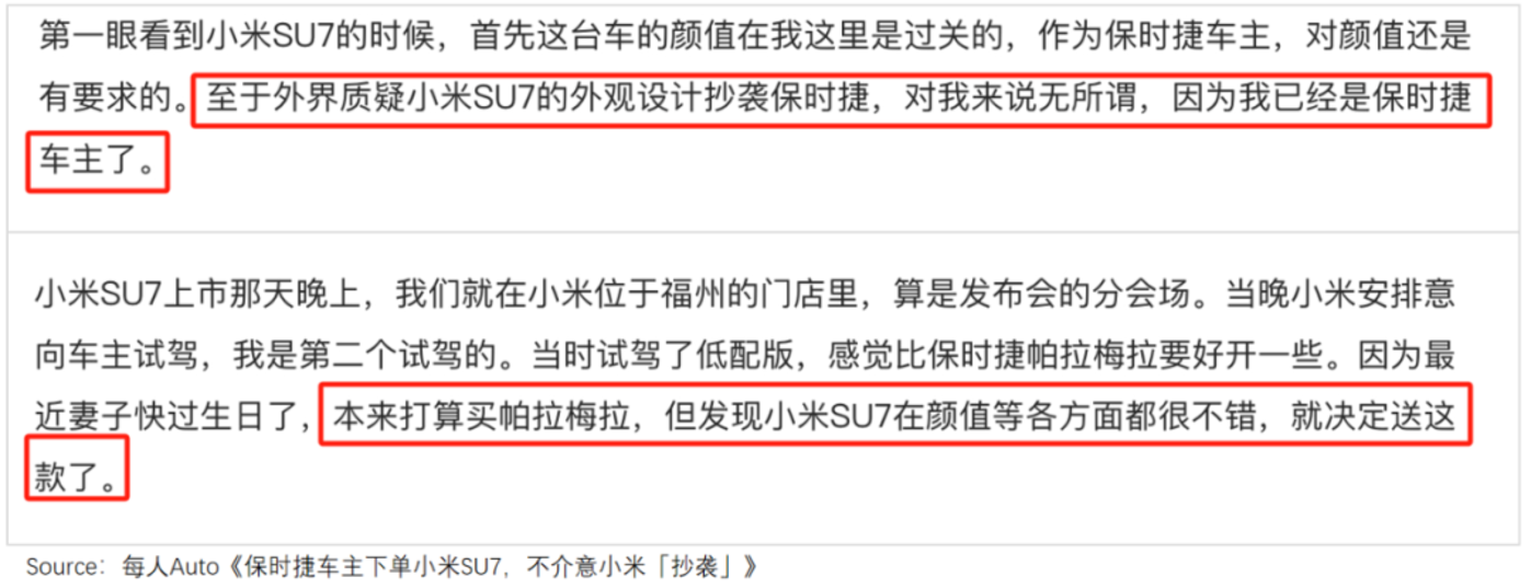 当下的小米 Su7,也不一定能抢走保时捷的消费者,但显然会给保时捷的品牌势能带来压力。