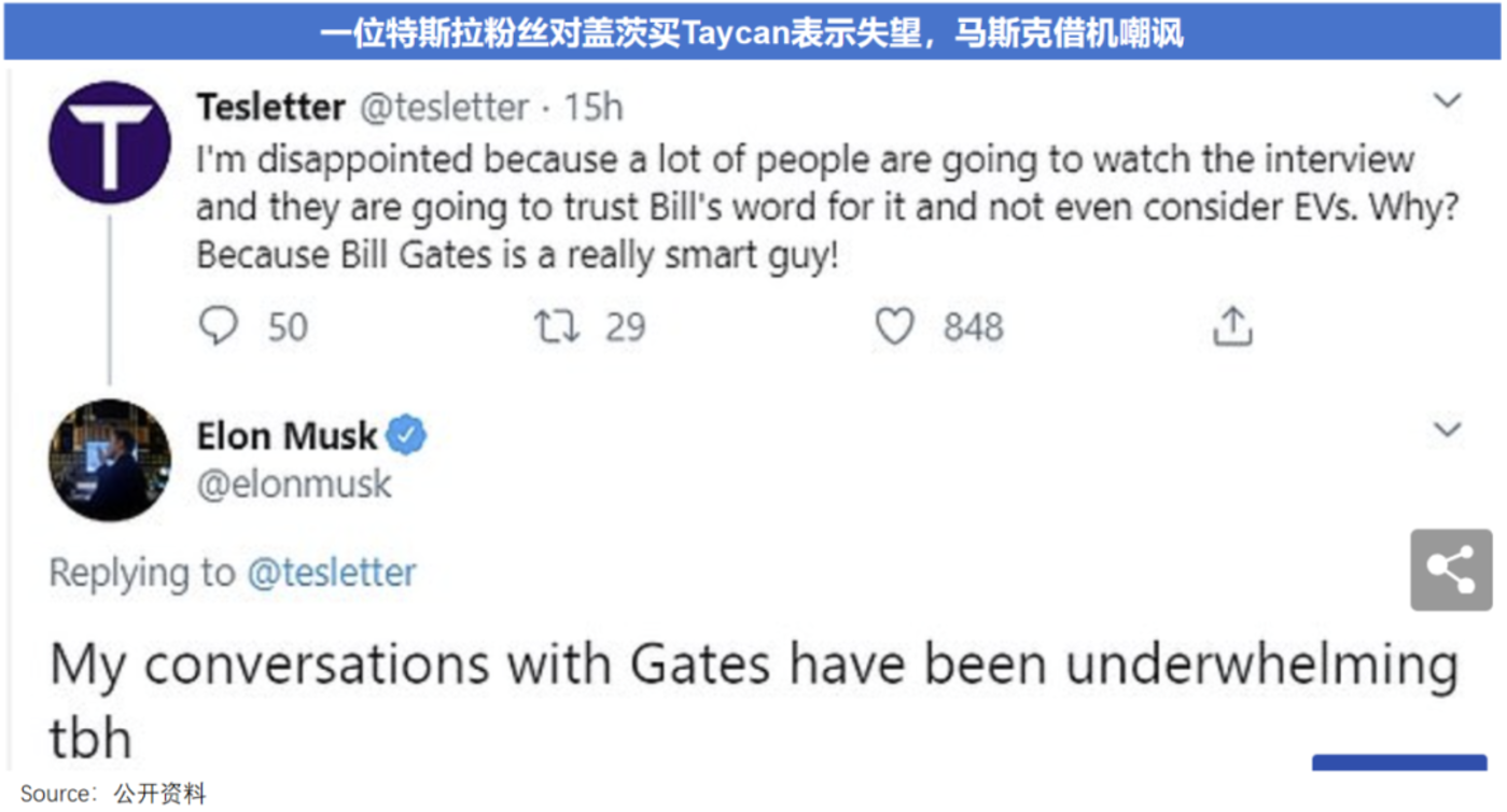 2020 年,马斯克在推特上向比尔·盖茨开炮,因为盖茨在采访里夸了特斯拉,最后却买了保时捷 Taycan。